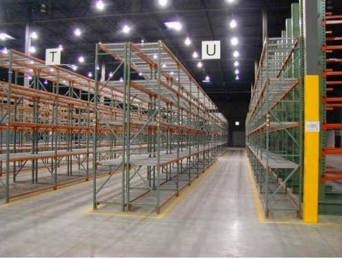托盘式货架,又俗称横梁式货架,或称货位式货架,通常为重型货架,在国内的各种仓储货架系统中最为常见。首先须进行集装单元化工作,即将货物包装及其重量等特性进行组盘,确定托盘的类型、规格、尺寸,以及单托载重量和堆高(单托货物重一般在2000KG以内),然后由此确定单元货轲的跨度、深度、层间距,根据仓库层架下沿的有效高度和叉车的最大叉高决定货架的高度。单元货架跨度一般在4m以内,深度在1.5m以内,低、高位仓库货架高度一般在12m以内,超高位仓库货架高度一般在30m以内(此类仓库基本均为自动化仓库,货架总高由若干段12m以内立柱构成)。此类仓库中,低、高仓库大多用前移式电瓶叉车、平衡重电瓶叉车、三向叉车进行存取作业,货架较矮时也可用电动堆高机,超高位仓库用堆垛机进行存取作业。此种货架系统空间利用率高,存取灵活方便,辅以计算机管理或控制,既适用于多品种小批量物品,又适用于少品种大批量物品。此类货架在高位仓库和超高位仓库中应用最多(自动化仓库中货架大多用此类货架)。