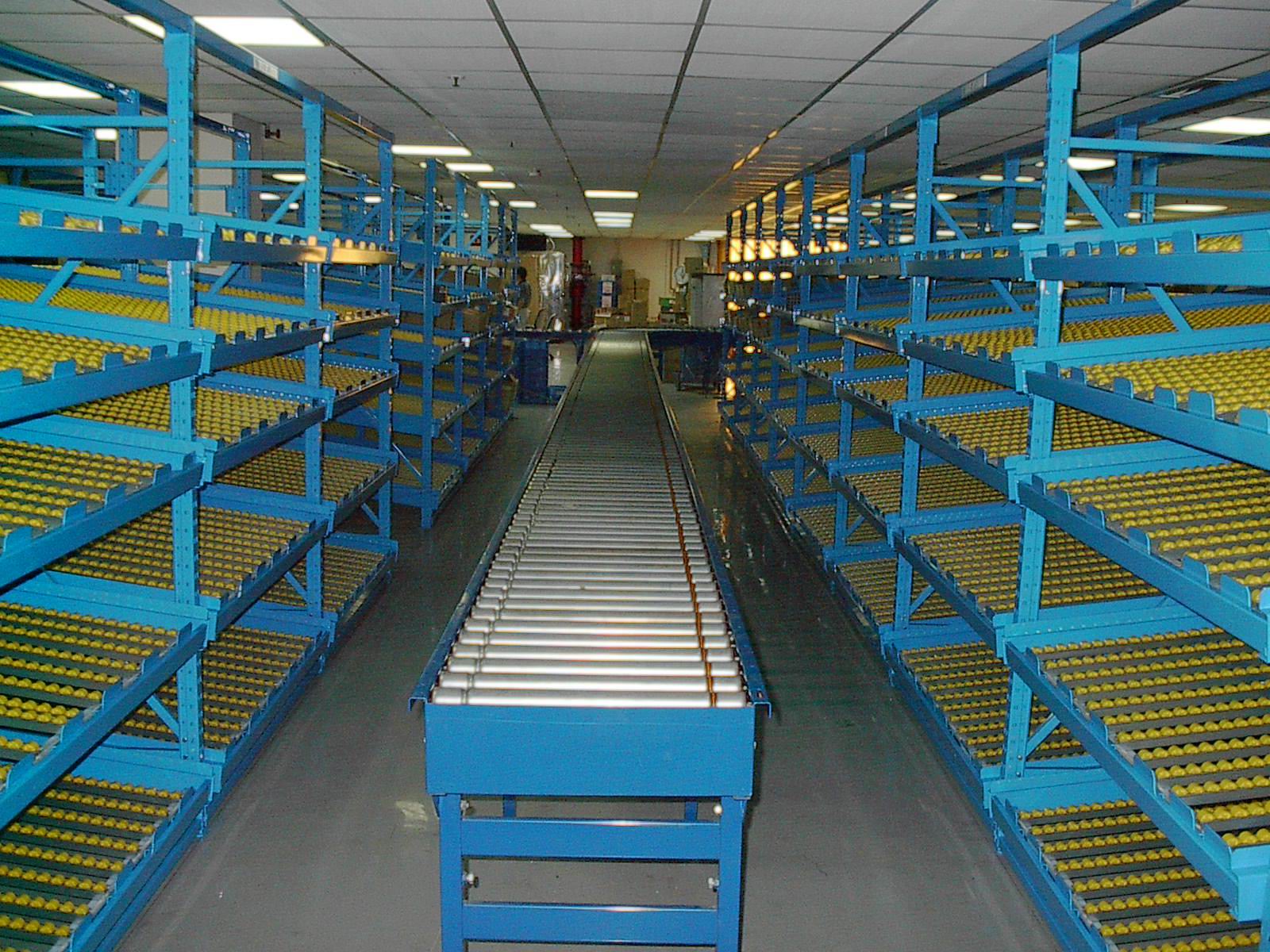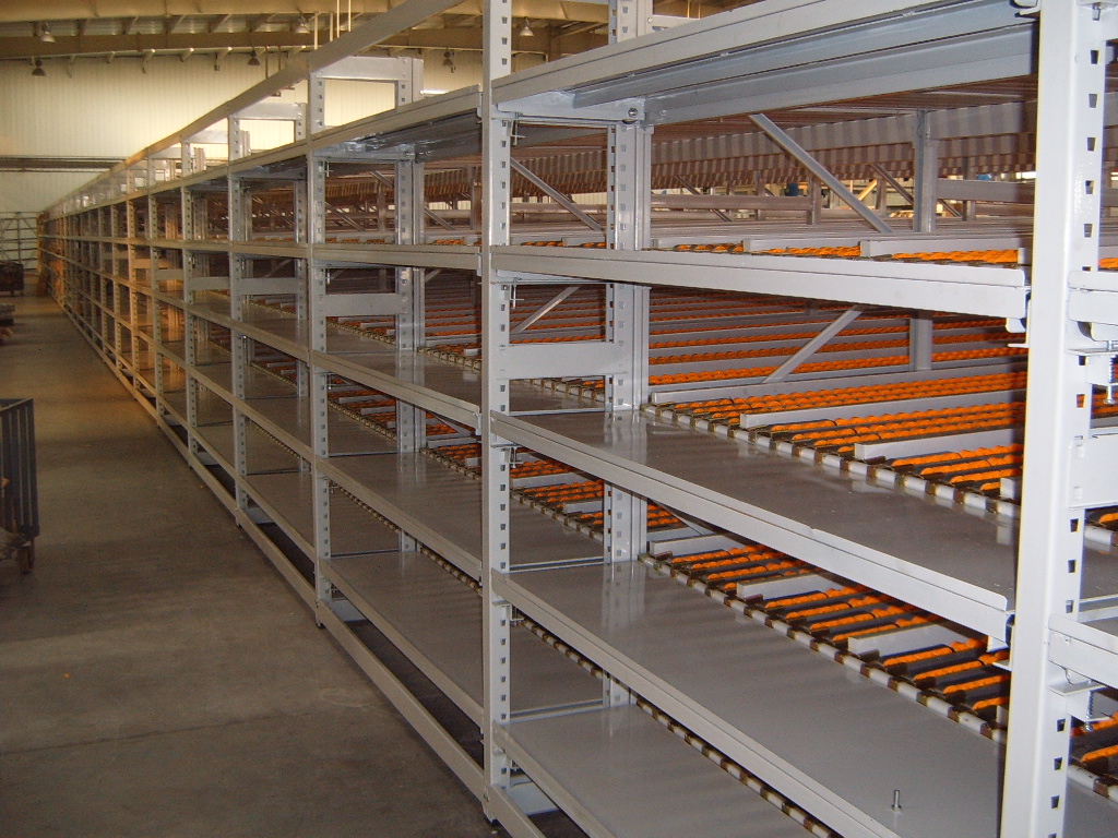 流利式货架通常由中型横梁式货架演变而成,货架每层前后横梁之间设置滚轮式铝合金或钣金式流力条,呈一定坡度(30左右)放置。货物通常为纸包装或将货物放于塑料周转箱内利用其自重实现货物的流动和先进先出,货物由小车进行运送,人工存取,存取方便,单元货架每层载重量通常在1000KG以内,货架高度在2.5米以内。适于装配线两侧的工序转换、配送中心的拣选作业等场所,可配以电子标签实现货物的信息货管理。