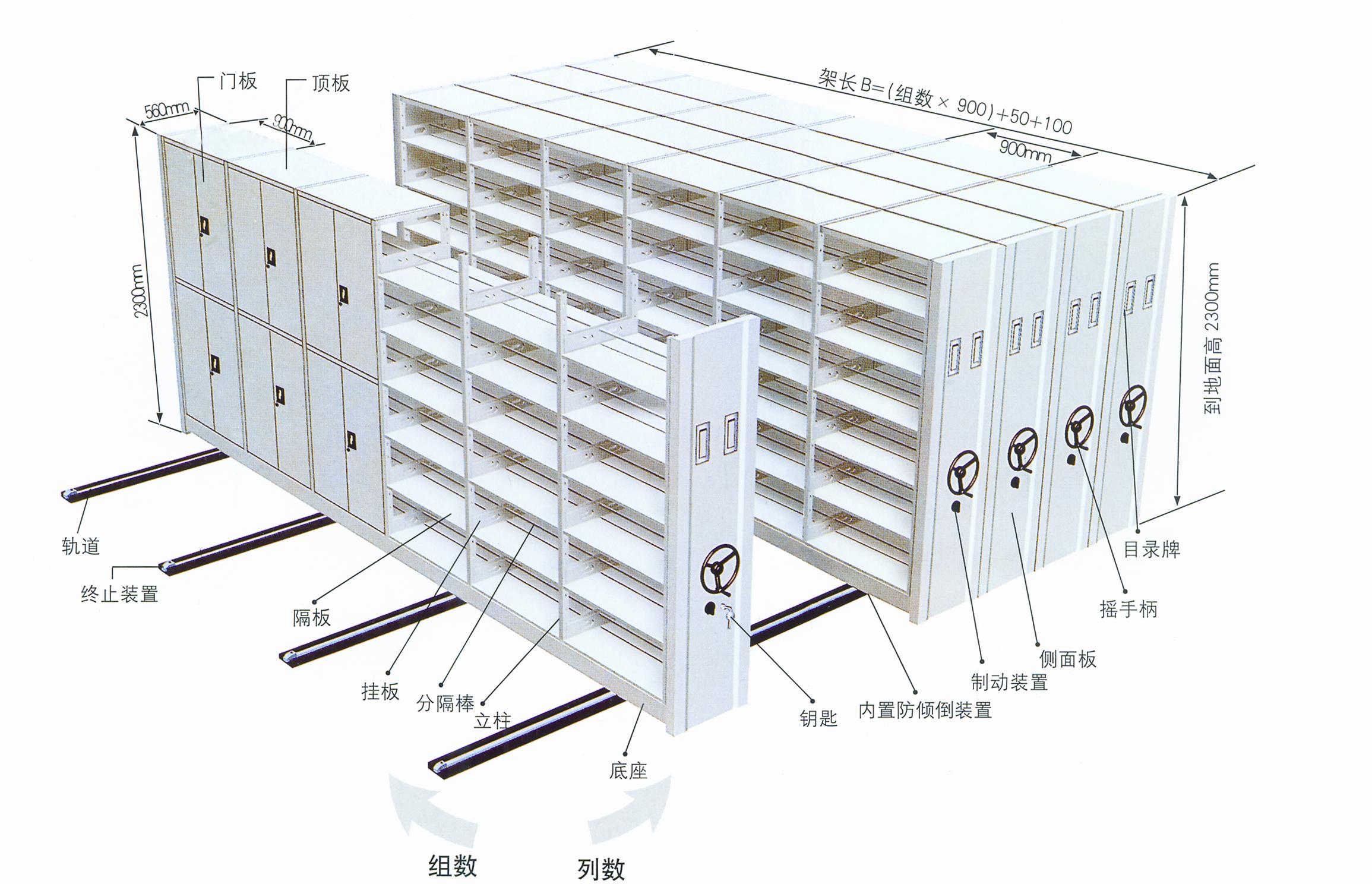 轻中型移动式货架(也称密集架)由轻、中型搁板货架演变而成,密集式结构,仅需设一个通道(1m宽左右),密封性好,美观实用,安全可靠,是空间利用率最高的一种货架,分手动和电动两种类型。导轨可嵌入地面或安装于地面之上,货架底座沿导轨运行,货架安装于底座之上,通过链轮传动系统使每排货架轻松、平稳移动,分为手动和电动,货物由人工进行存取。为使用使货架系统运行中不致倾倒,通常设有防倾倒装置。主要用于档案馆、图书馆、银行、企业资料室、电子轻工等行业。 重型移动式货架由重型托盘式货架演变而成,裸露式结构,仅需设1—2个通道,空间利用率极高。结构与轻中型移动式货架类似,主要用于一些仓库空间不是很大、要求最大限度地利用空间的场所,适用于机械制造等行业。