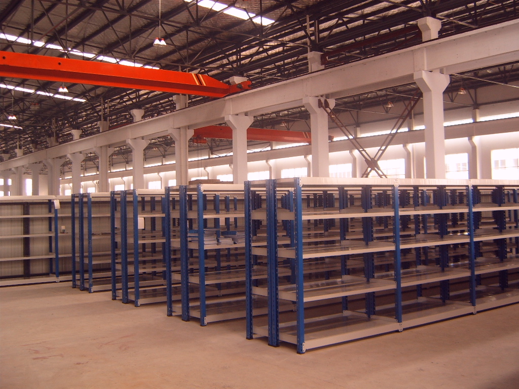 单元货架每层载重量一般100— 500KG 之间,总承载一般不大于2 500KG 。单元货架跨度通常不大于 2.6m ,深度不大于 1m ,高度一般在 3m 以内。如果单元货架跨度在 2m 以内,层载 500KG 以内,通常选无梁式中型搁板式货架较为适宜;如果单元货架跨度在 2m 以上,则一般只能选有梁式中型搁板式货架。无梁式中型货架与有梁式中型货架相比,层间距可调余地更大,更稳固、漂亮,与环境的协调性更好,更适于一些洁净度要求高的仓库;有梁式中型搁板式货架则工业化特点强一些,较适用于存放金属结构产品。中型搁板式货架应用广泛,适用于各行各业。