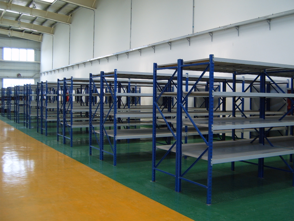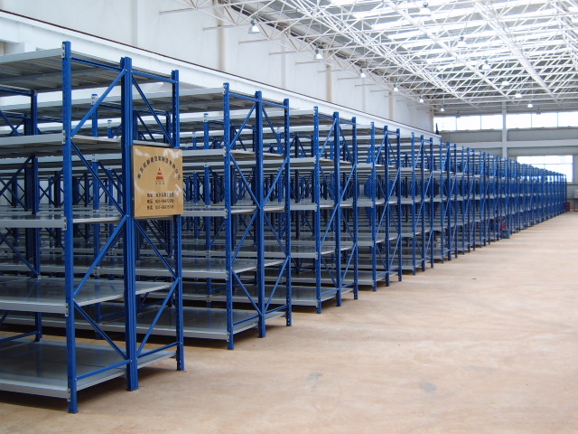 中B型搁板式货架 单元货架每层载重量一般200-—700KG之间,总承载一般不大于5000KG。单元货架跨度通常不大于2.6m,深度不大于1m,高度一般在3m以内。如果单元货架跨度在2m以内,层载500KG以内,通常选无梁式中型搁板式货架较为适宜;如果单元货架跨度在2m以上,则一般只能选有梁式中型搁板式货架。无梁式中型货架与有梁式中型货架相比,层间距可调余地更大,更稳固、漂亮,与环境的协调性更好,更适于一些洁净度要求高的仓库;有梁式中型搁板式货架则工业化特点强一些,较适用于存放金属结构产品。中型搁板式货架应用广泛,适用于各行各业。